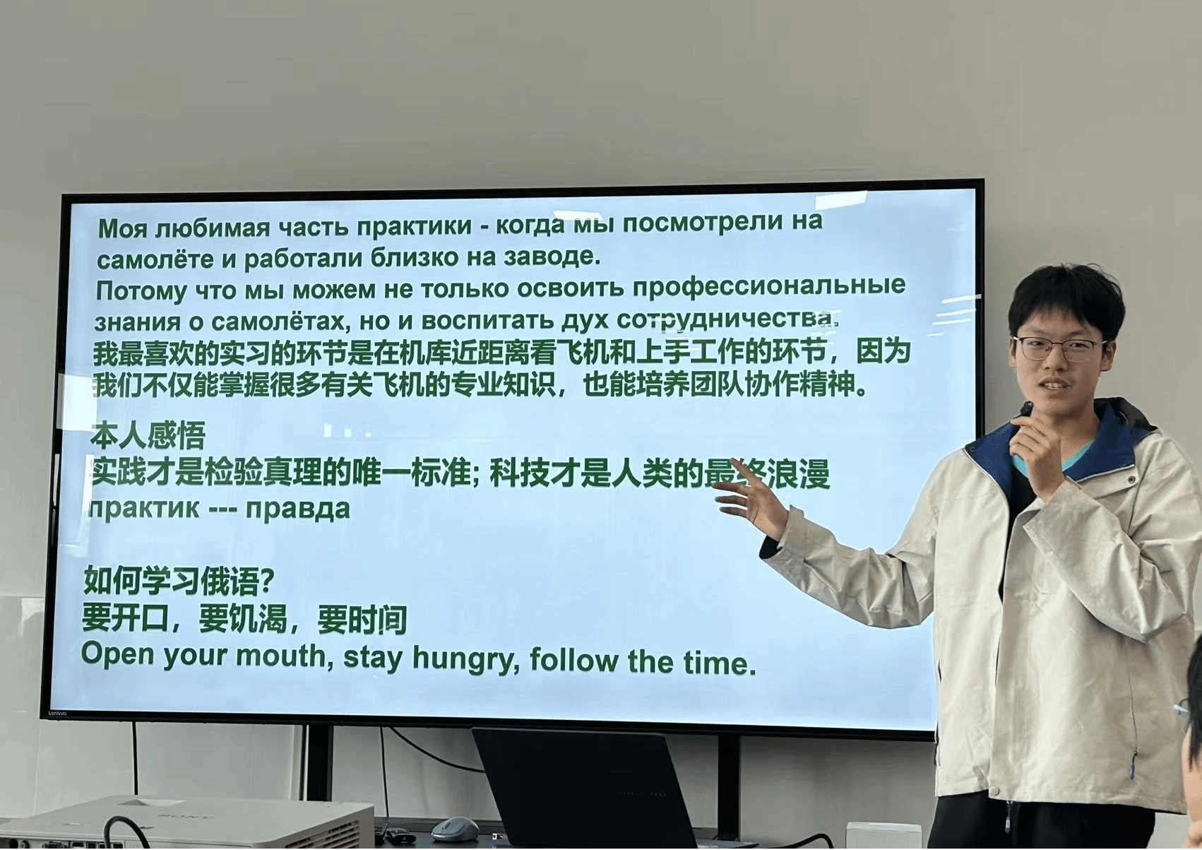 “По итогу практики было проведено 5 уроков русского языка с китайскими студентами. Темы: «Моя первая практика», «Космическая база», «Мои любимые части практики», «Известные самолеты» и «Итог практики». В процессе уроков студенты учили новые слова на тематику пройденных уроков, а также изучали новые грамматические схемы. Уроки были направлены на развитие речевого навыка китайских студентов. В группах по 7 студентов было уделено личное время каждому ученику для улучшения навыка владения русского языка.” ——留学生 BOIARKINA,VALERIIA