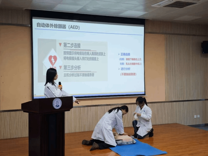 在急救技能培训环节,宣讲团成员、神经外科硕士研究生周明静以《心肺复苏(CPR)——关键时刻的生命守护》为题,结合《2025 AHA心肺复苏及心血管急救指南》最新标准,系统讲解了心脏骤停识别、胸外按压规范、人工呼吸配合及AED操作流程。宣讲团成员现场进行了标准流程演示,详细示范了按压部位定位、手势姿势、力度频率等关键要点。
