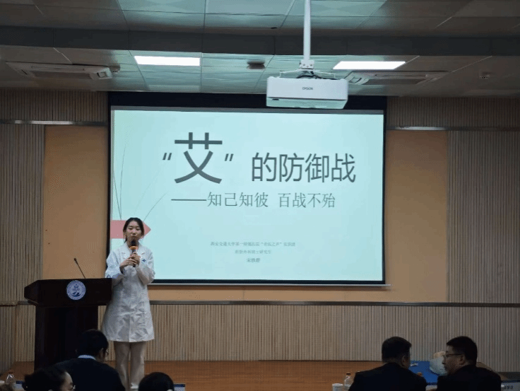 宣讲团成员宋轶群博士以《“艾”的防御战》为题,介绍了HIV与AIDS基本概念,讲解了临床分期与传播途径等内容,通过“三问判断感染风险”实用方法与高危后阻断药使用原则等专业介绍向在场的师生普及了艾滋病防护知识,用今年“世界艾滋病日”的宣传主题“社会共治,守正创新,终结艾滋”引导师生建立科学防护意识。