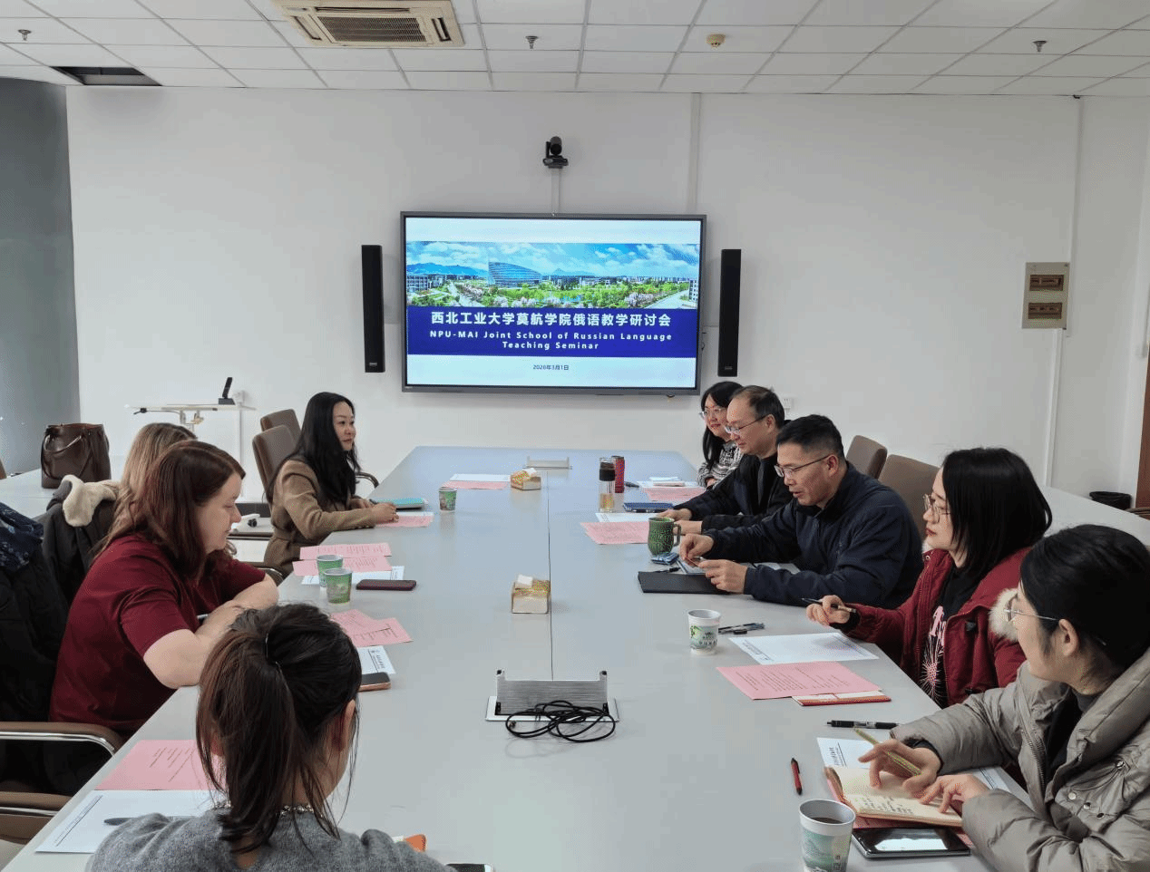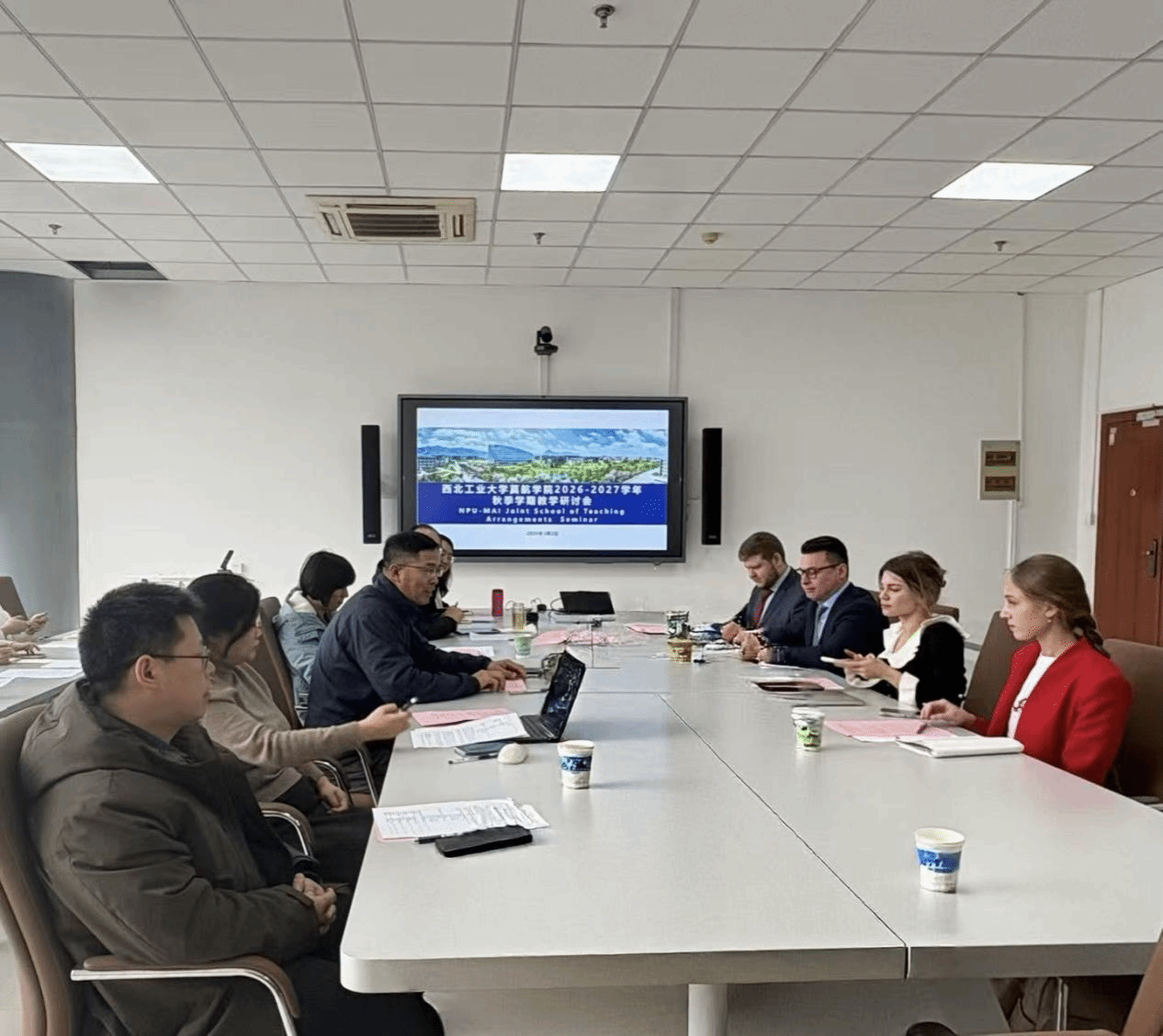 3 月 2 日上午,2026—2027 学年秋季学期教学工作研讨会顺利举行。代富平书记介绍双方参会代表,范晓丽院长致欢迎辞,她表示,新年伊始,热烈欢迎俄方代表到访,期待双方以本次研讨为契机,共同提升本科教学质量。莫斯科航空学院国际部负责人 Alexey Zarechenskiy 高度评价西北工业大学人才培养成效,希望未来中俄双方携手培育更多优秀人才。随后,双方围绕课程安排、教材选用、教学任务等关键环节深入研讨,对照联合办学专业培养目标,逐项梳理秋季学期教学工作细节,明确师德师风、课程师资配置、教学内容审核、教材报备、教学任务填报等管理规范。双方共同审议秋季学期教学安排方案,就具体内容提出优化完善建议,确保教学安排科学合理、贴合教学实际。
