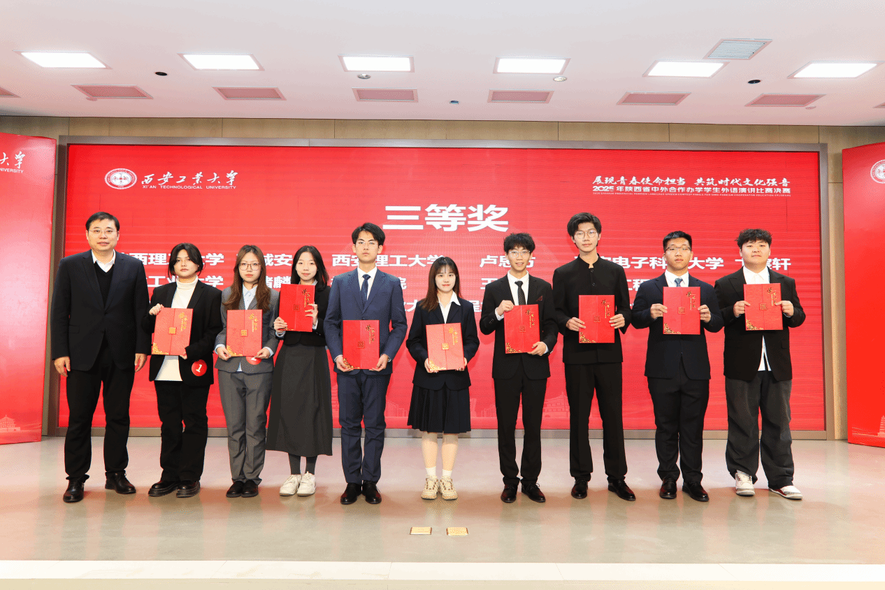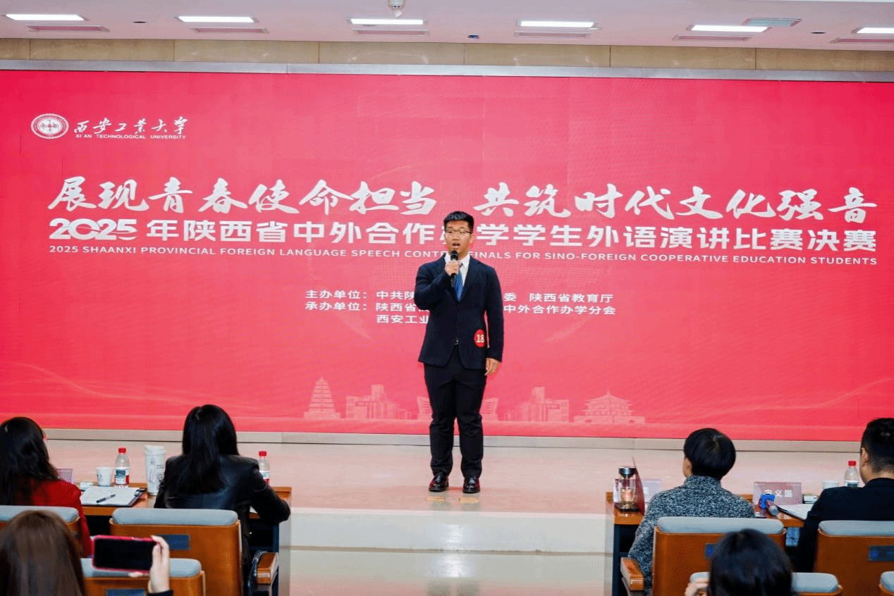 11月25日,由中共陕西省委教育工委、陕西省教育厅主办,陕西省高等教育学会中外合作办学分会、西安工业大学共同承办的2025年陕西省中外合作办学学生外语演讲比赛决赛暨颁奖仪式在西安工业大学(未央校区)隆重举行。本次比赛共吸引来自全省23所院校的63名学生参赛。莫航学院2025级本科生李储麟表现突出,在比赛中荣获三等奖。2025级本科生李宇腾、徐小雅获得优秀奖。